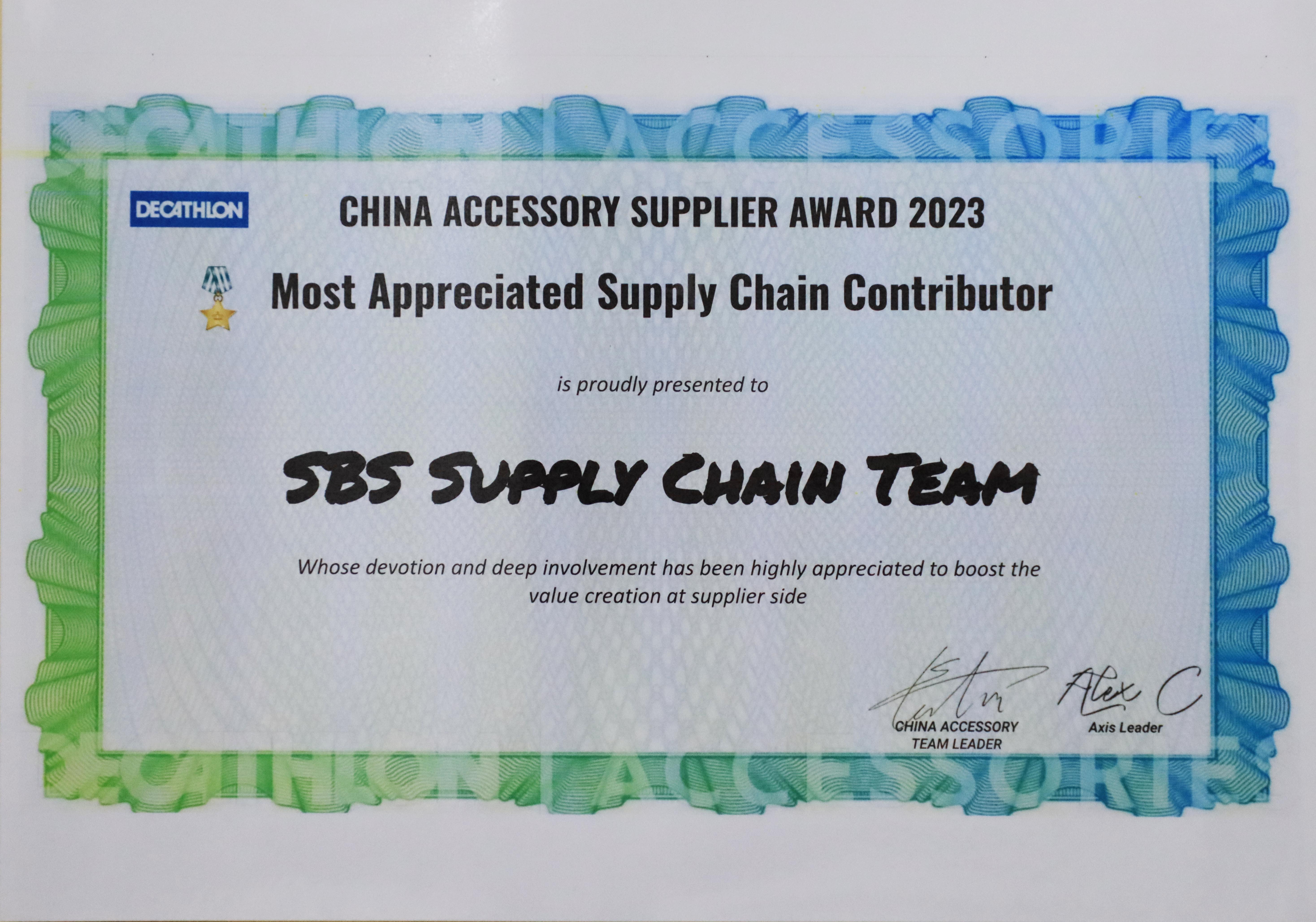 SBS潯興拉鏈榮獲“2023年迪卡儂中國(guó)輔料供應(yīng)商最佳供應(yīng)鏈貢獻(xiàn)獎(jiǎng)”